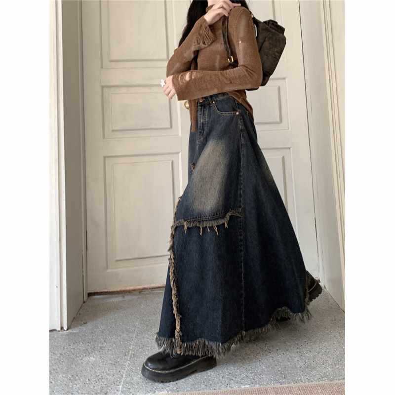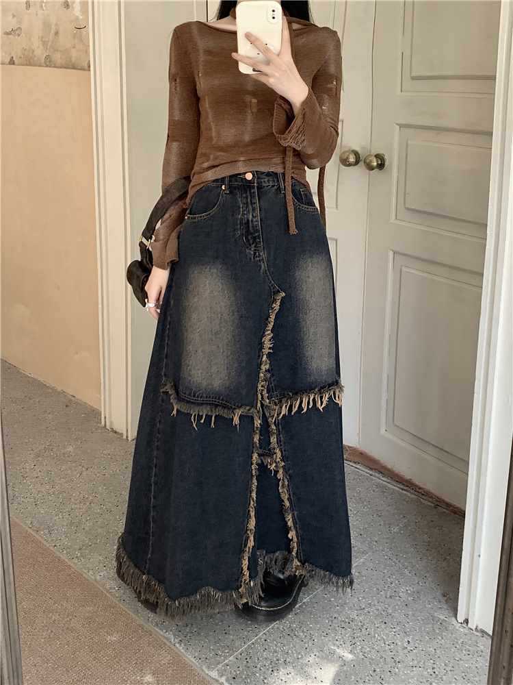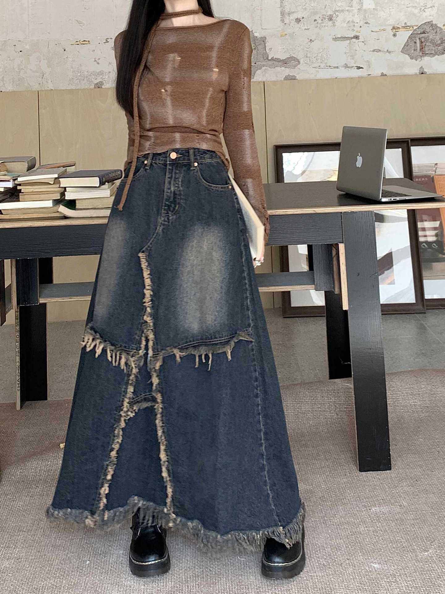 ヴィンテージ風のデニムマキシロングスカートが登場しました。個性的なカジュアルスタイルを楽しみたい方にぴったりのアイテムです。足元までしっかりと覆うロング丈で、秋冬の着こなしにぴったり。